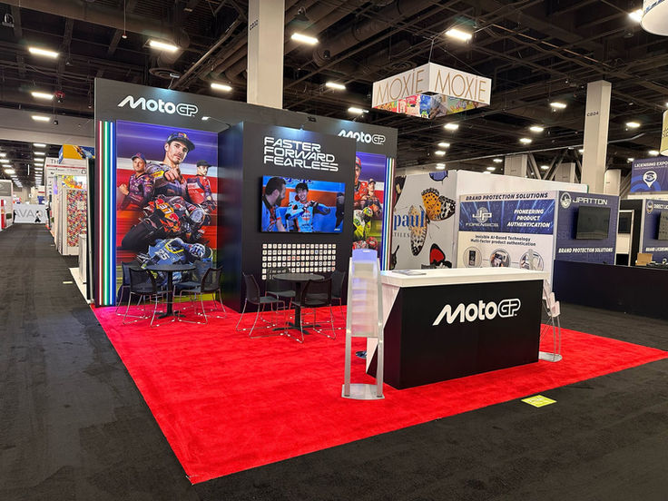 Our team designed a bold 20' x 20' exhibition stand for MotoGP at the Brand Licensing Expo in Las Vegas, combining high-impact visuals with smart functionality. The stand featured a striking LED element in MotoGP’s brand colors, complemented by large stretch fabric graphics that created an immersive brand presence. A custom-built reception counter provided a welcoming focal point, while expansive fabric displays ensured the MotoGP identity stood out across the show floor.